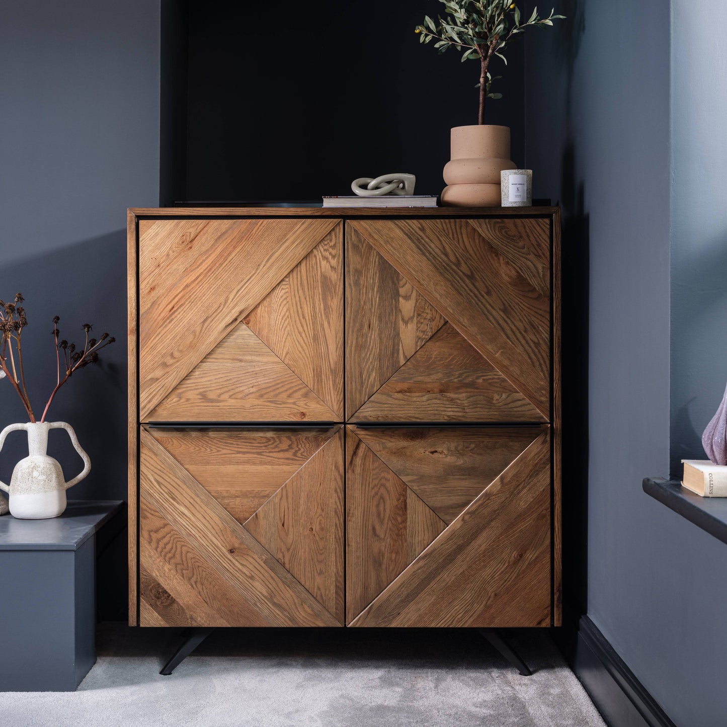 The American Smokey Oak High boards design is a true testament to artisanal craftsmanship, featuring four spacious cupboards adorned with a distinctive diamond pattern in a contemporary geo design. The juxtaposition of the intricate facias against the rustic oak creates a visually striking and sophisticated aesthetic.