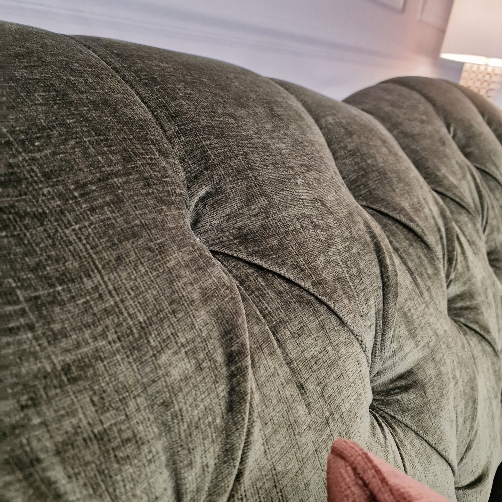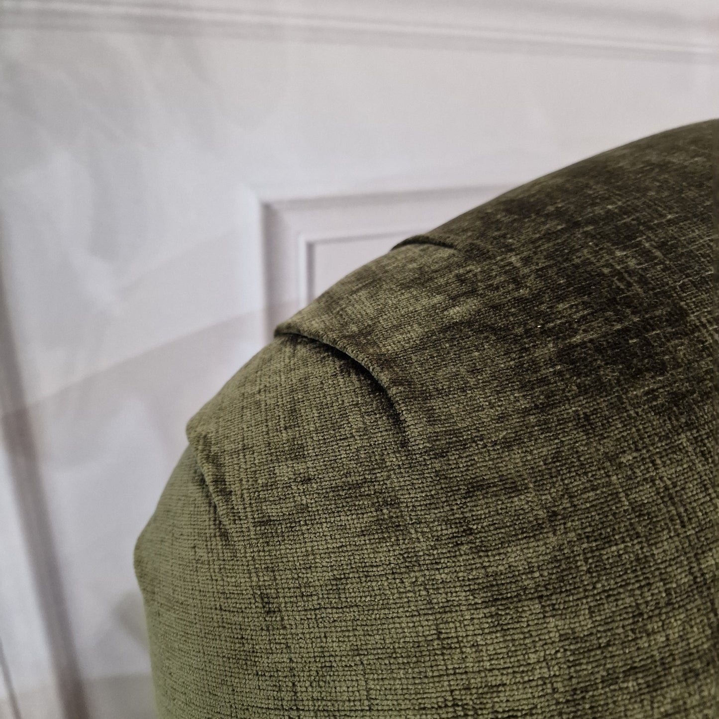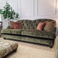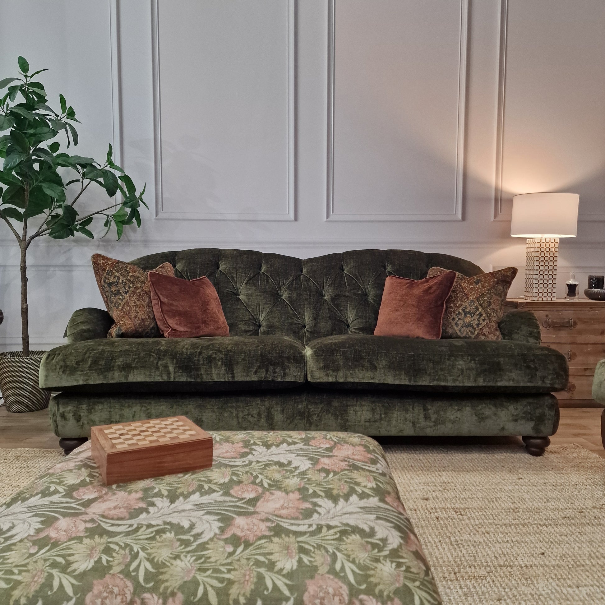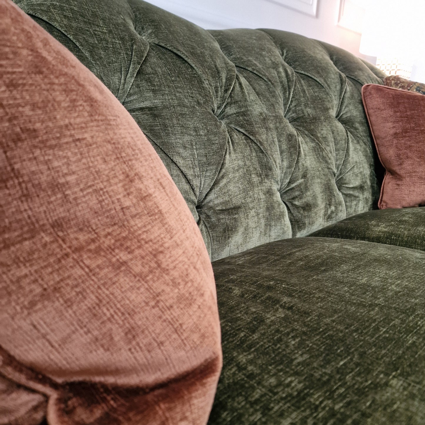The Dumpling sofa draws inspiration from classic 19th-century design heritage, named in honour of timeless British craftsmanship. Its graceful silhouette features a gently arched, sprung back, distinctive low rolled arms, and a generously deep seat—perfect for sinking into on a slow Sunday afternoon, the product image specification is a 3 seater in Dion Olive, 2 Scatter cushions in Wilson Bronze, and two Dion Brandy, Feet - Walnut