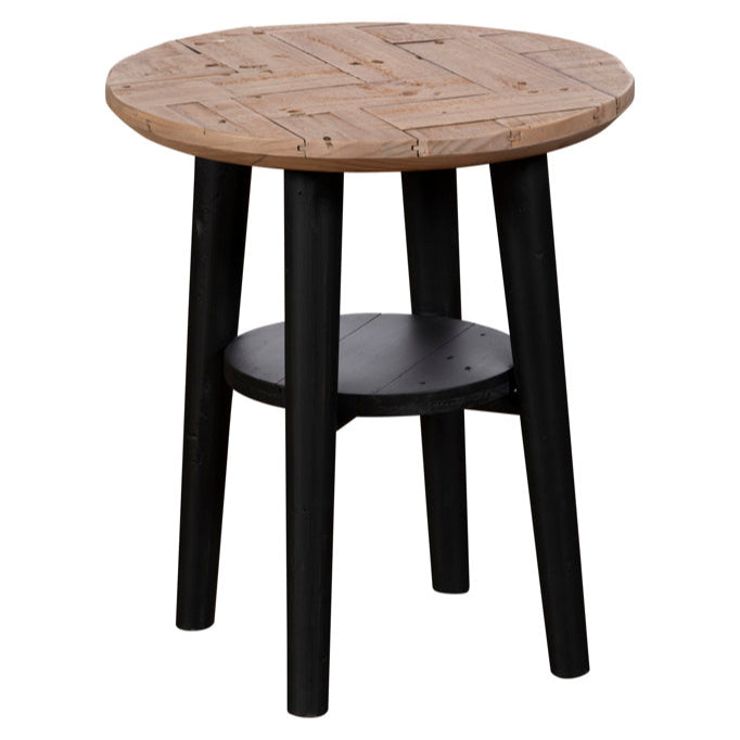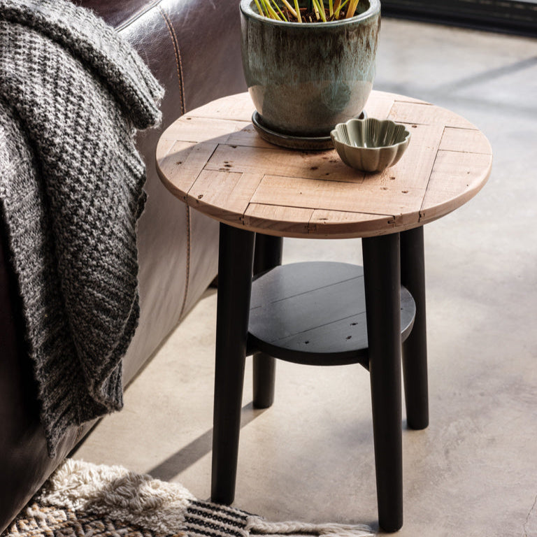 Handcrafted from characterful 100% reclaimed SFC timber using traditional techniques, the Franklin Dining range includes a round lamp table with a distinctive chevron design top. The table features black painted wooden legs and a secondary shelf for added functionality. Matching items are available, including a sideboard and coffee table, allowing you to complete your living space with style and cohesion.