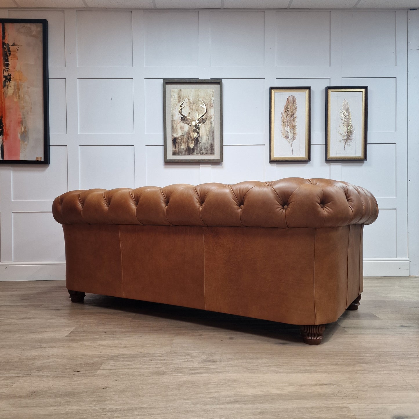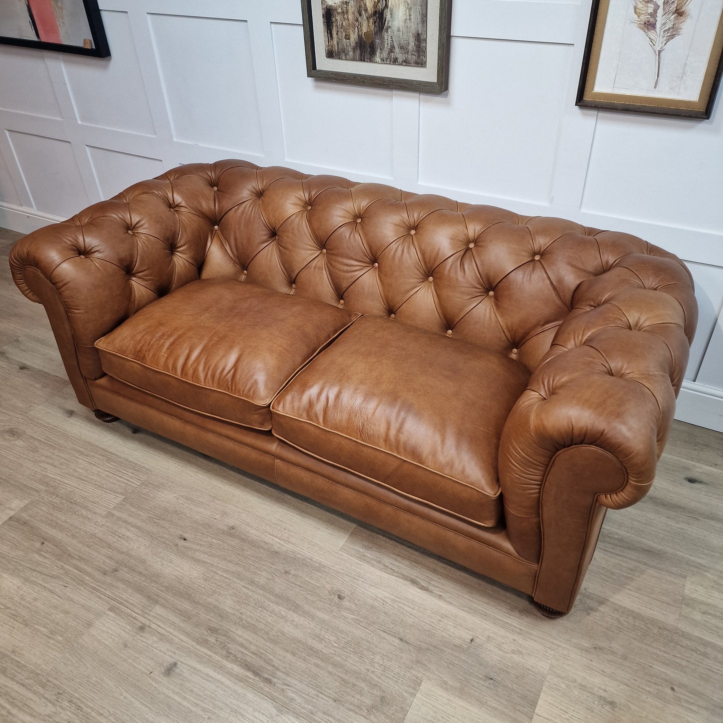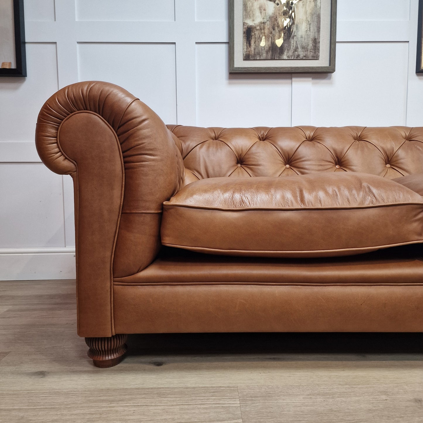 Explore endless design possibilities at our showroom. Customize this Chesterfield Sofa to your own specifications, or you can purchase this set specification model which is in our soft Brandi leather, it can tailored to match your unique style and preferences. Our skilled team is dedicated to realizing your vision, ensuring sophistication and elegance in every detail.