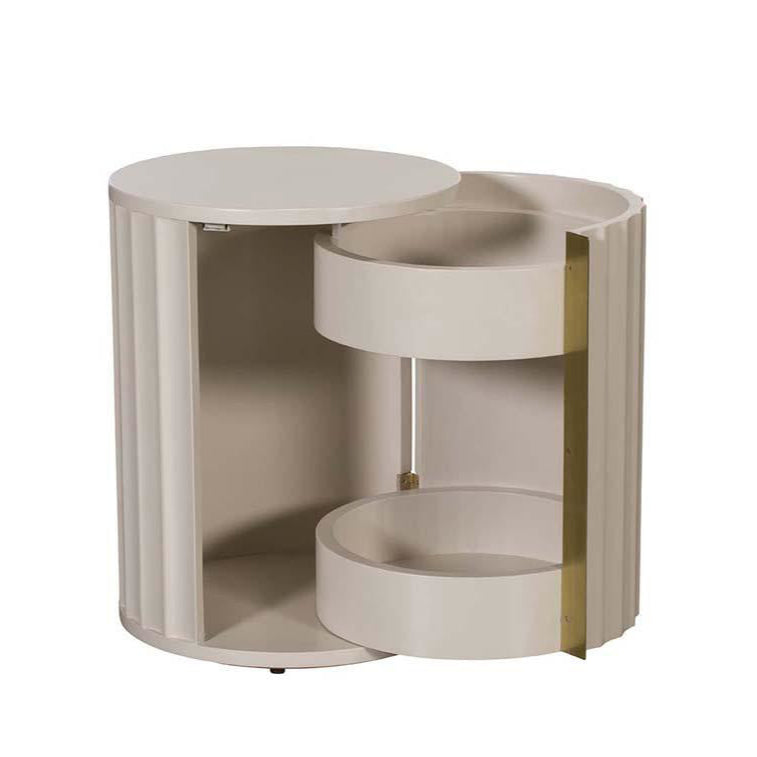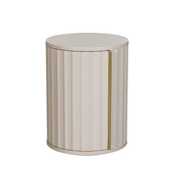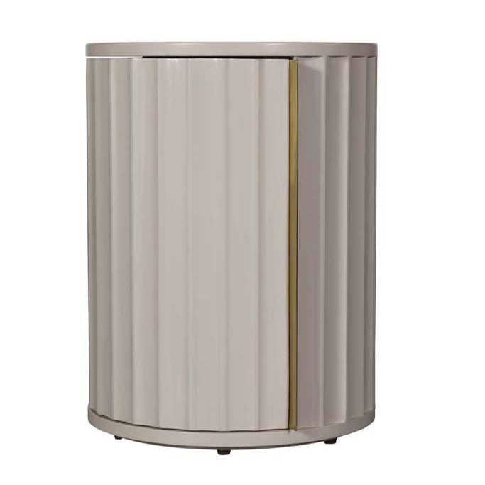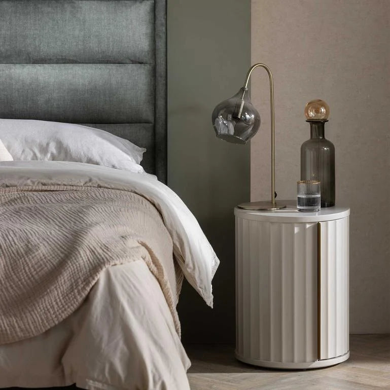 Part of the Lily range, this right-side bedside table is crafted from sustainable mahogany and fluted MDF with a painted finish, offering both durability and style. The elegant column design is complemented by slim handles and polished brass feet, adding a sophisticated touch. It features integrated curved cupboards with circular storage inside, providing functional and stylish storage. Matching items are available, including a dressing table and wardrobe, allowing you to create a coordinated and refined bedroom setting.