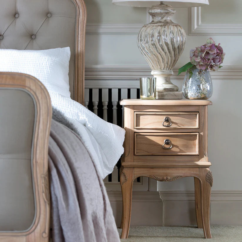 Part of the Limoges Bedroom range, this bedside table features a Louis-inspired design with intricate hand-carved details and traditional dove tail joints, offering timeless elegance. The subtle bow front and elegant, flared legs add sophistication, while the two drawers with brass drop handle pulls provide both style and practical storage. Matching items are available, including a wardrobe and dressing table, allowing you to create a coordinated and luxurious bedroom ensemble.