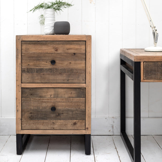 Part of the Nixon range, this filing cabinet is hand-crafted from 100% reclaimed FSC timber using traditional techniques, showcasing a characterful rustic planked construction. The black powder-coated metal ‘U’ feet with rub-through rust detailing add an industrial touch to the design. It features two deep drawers with internal fixings for hanging files, and the cast iron trumpet handles provide a vintage finish.
