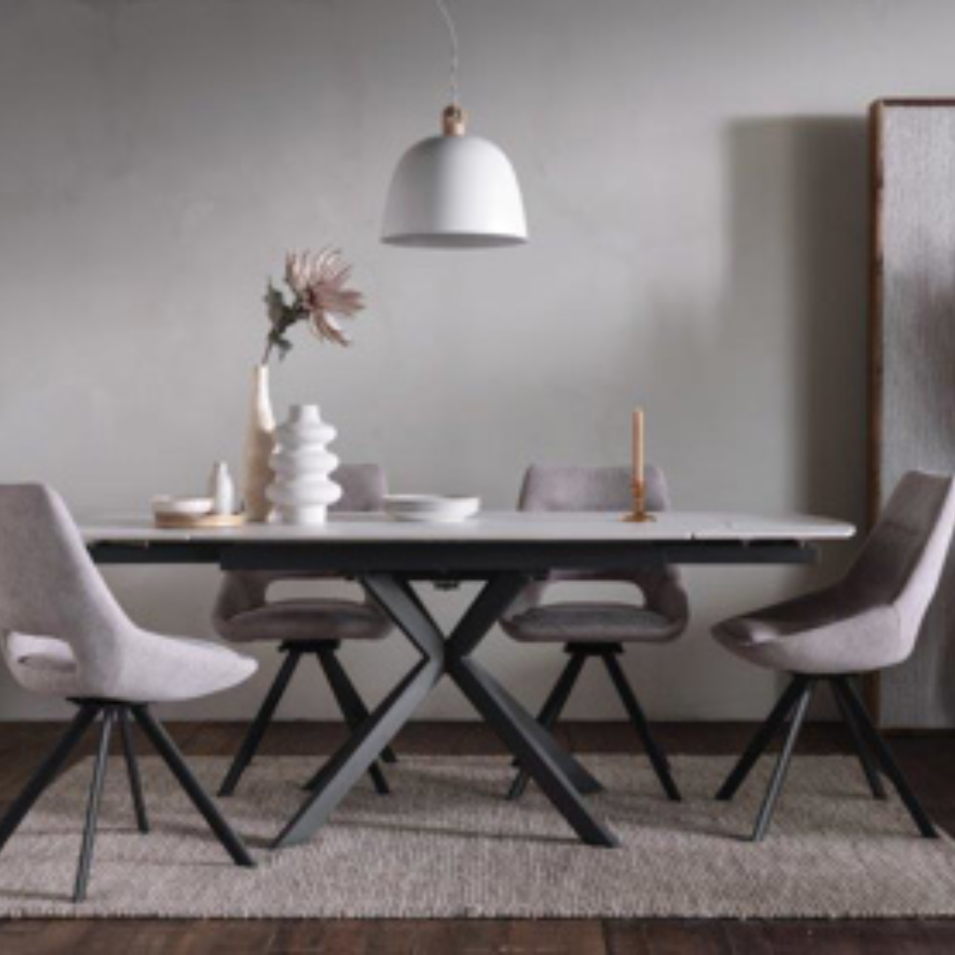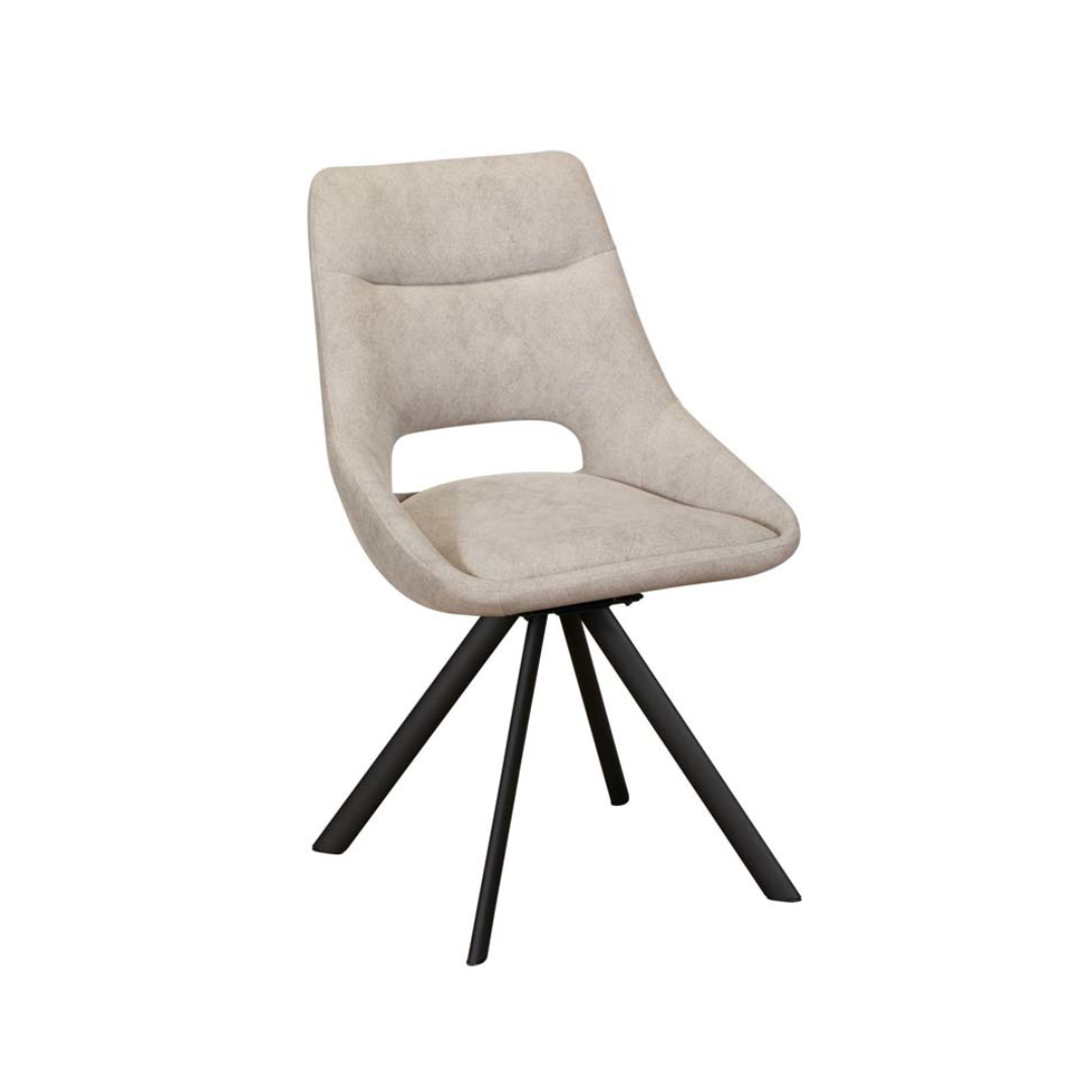 This stylish chair features soft light grey cotton upholstery, accented with a distinctive cut-out detail at the back of the seat. The black powder-coated metal star-shaped legs with a swivel mechanism provide both functionality and modern flair. Perfectly styled with the Tietro and Sintered Stone Dining Range, it adds elegance and comfort to any dining space.